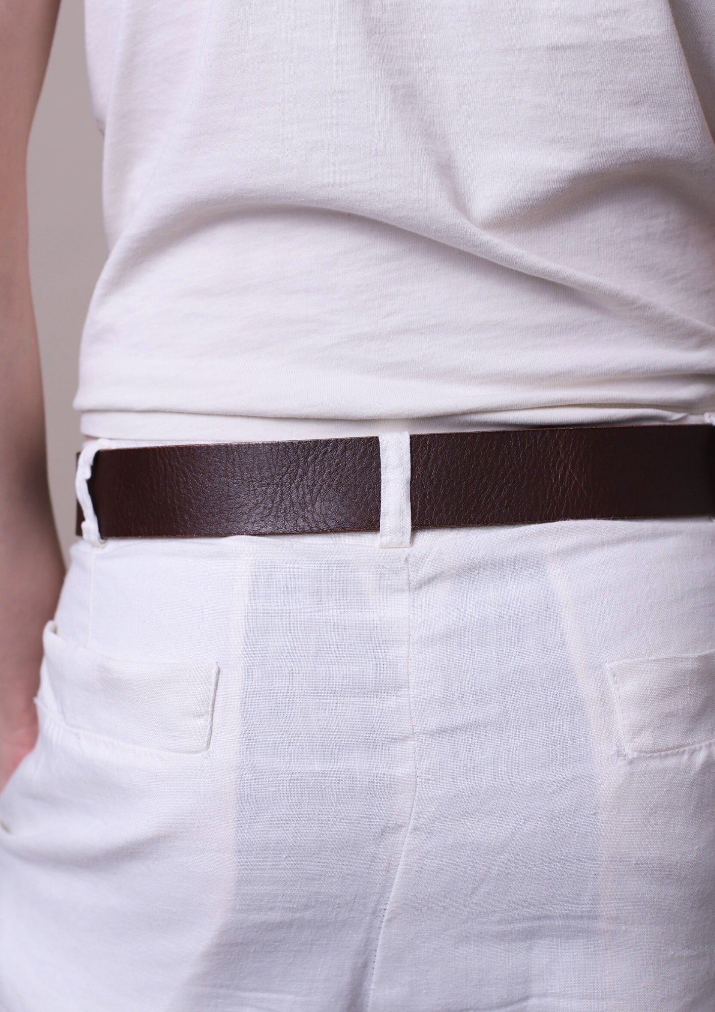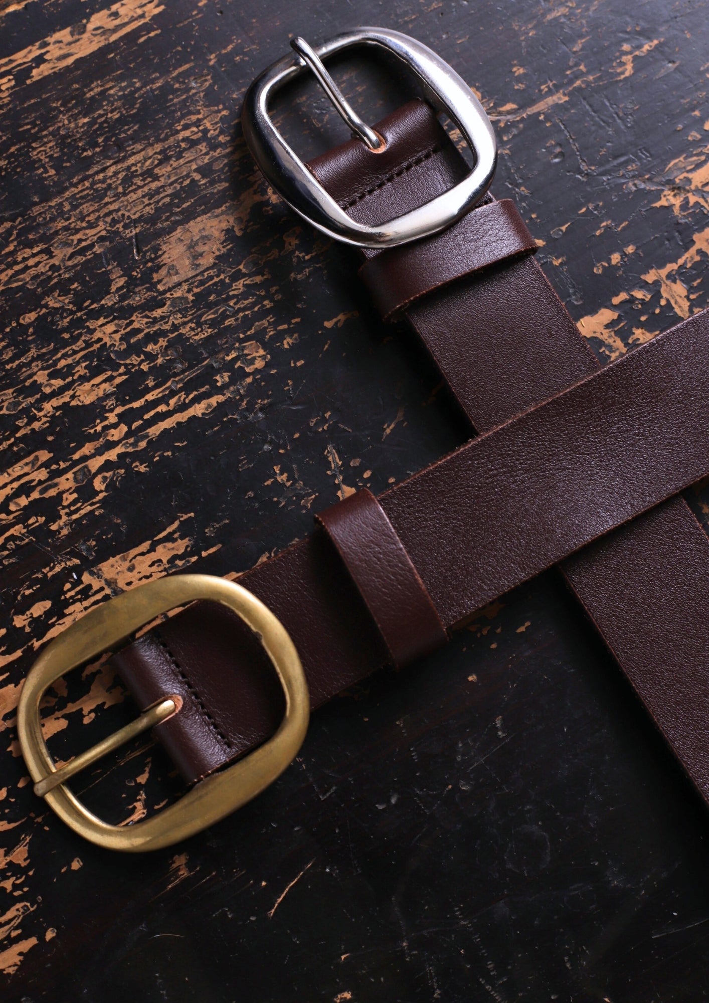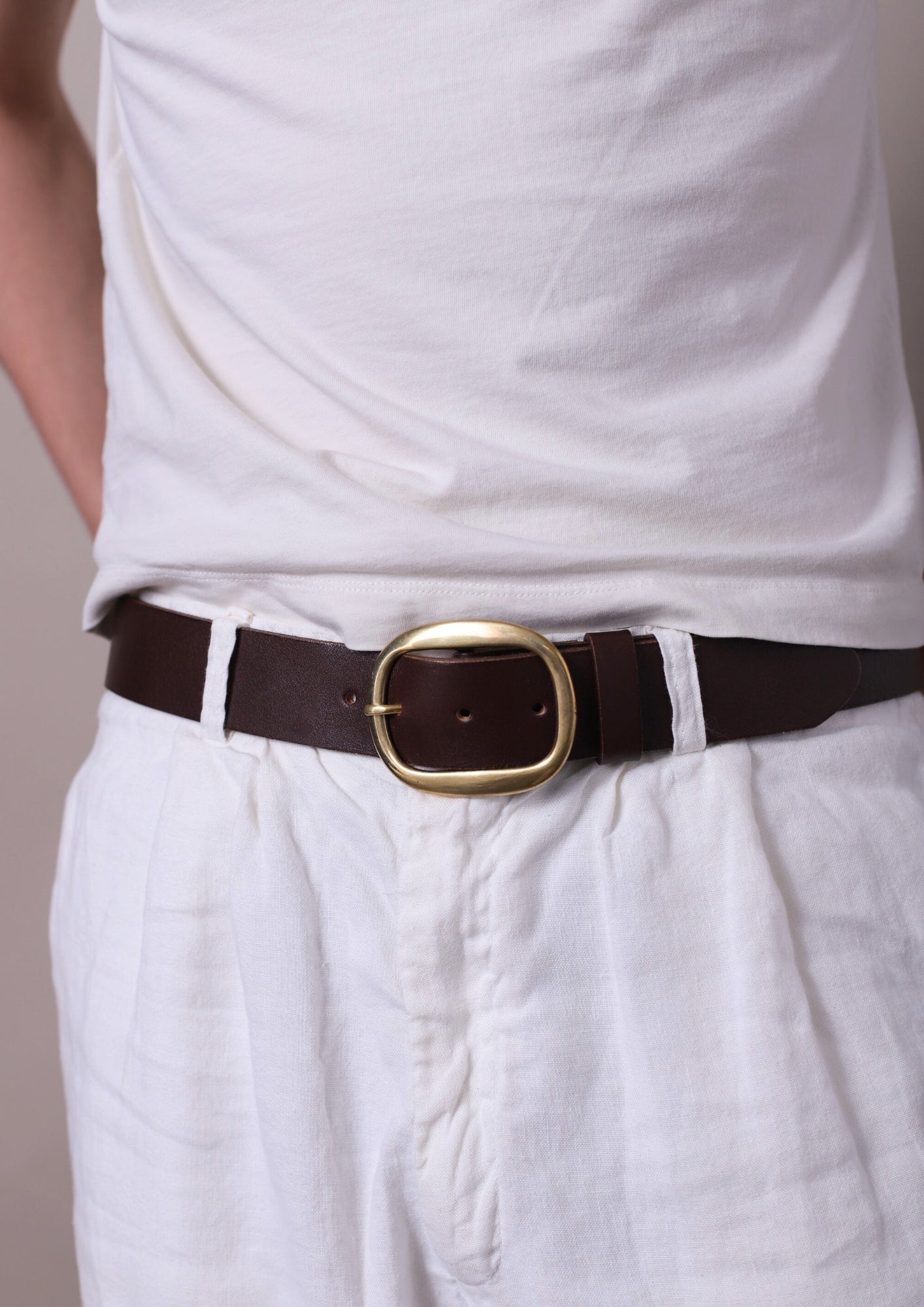 A belt that lets the material speak for itself: smooth leather in a cognac or Havana finish, crafted to highlight its natural richness. The buckle, available in brass or contemporary silver-plated, reinforces its versatile and sophisticated character.