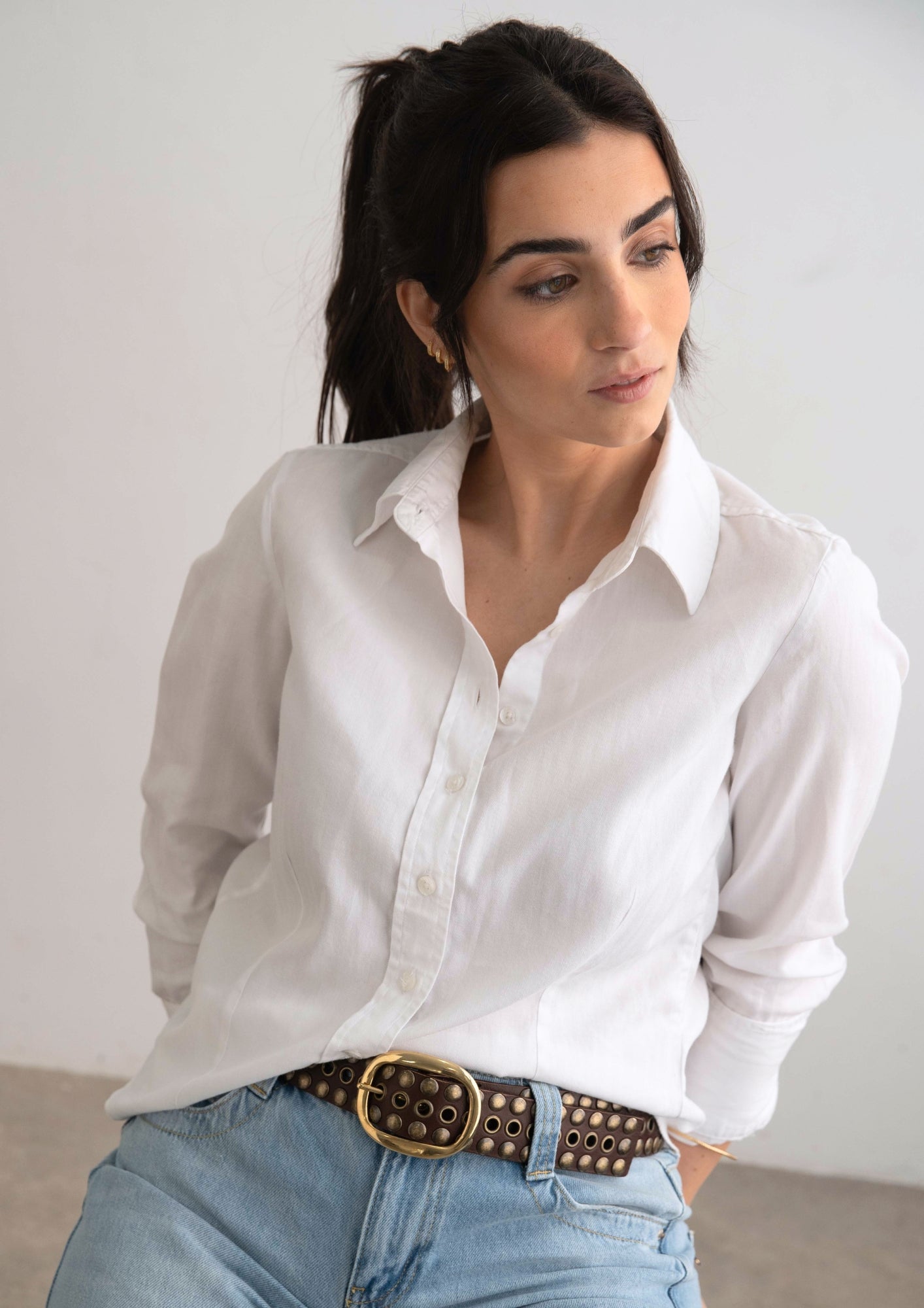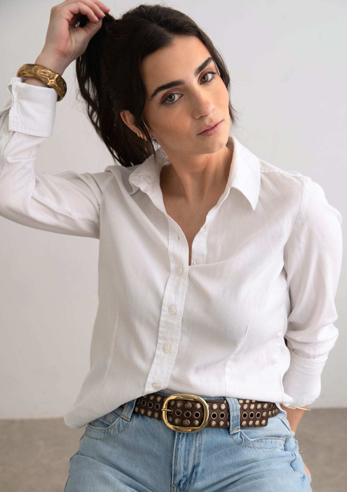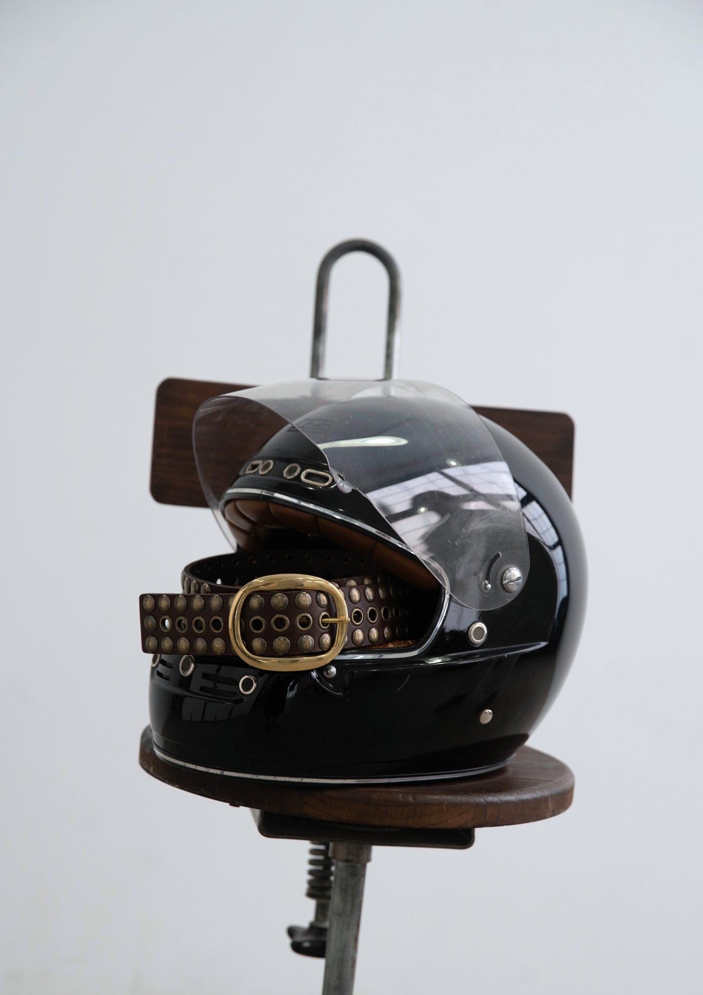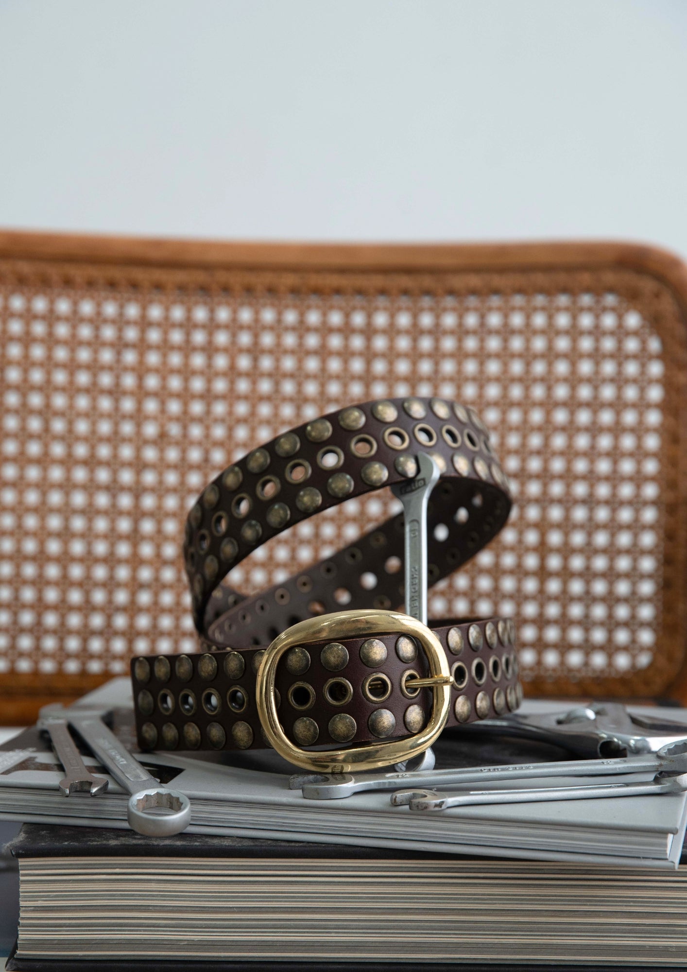 Cuero italiano en tono chocolate, de estructura firme y acabado natural, trabajado con hileras uniformes de tachuelas y ojales metálicos en acabado envejecido a lo largo de toda la pieza.